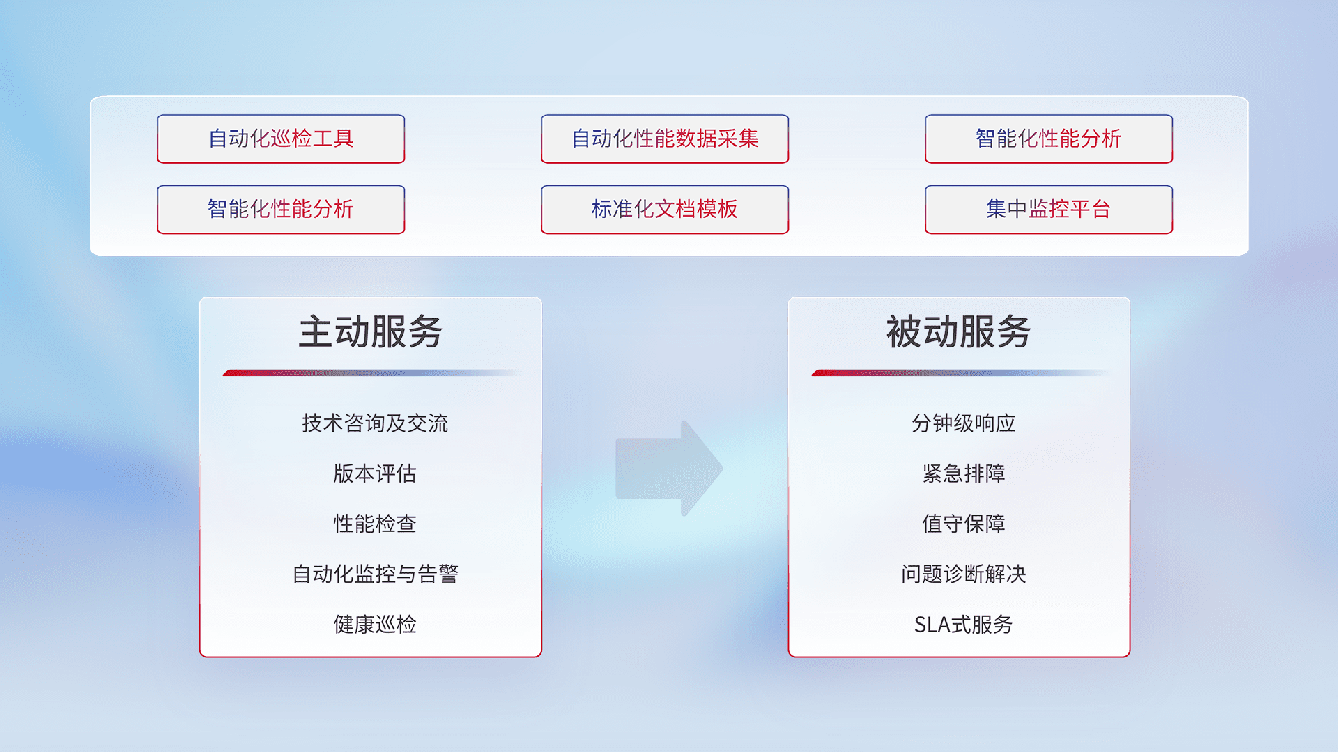 智能化工具和标准化文档,,保障服务质量,,提供主动服务(包含技术咨询、、、、版本评估、、、性能检查、、、、自动化监控与告警、、、、健康巡检)和被动服务包含(分钟级响应、、、、紧急排障、、值守保障、、问题诊断解决、、SLA服务)。。